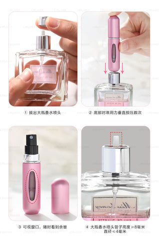 Reabasteça seu spray diretamente de qualquer frasco de perfume padrão através da tecnologia patenteada na parte de baixo do frasco.